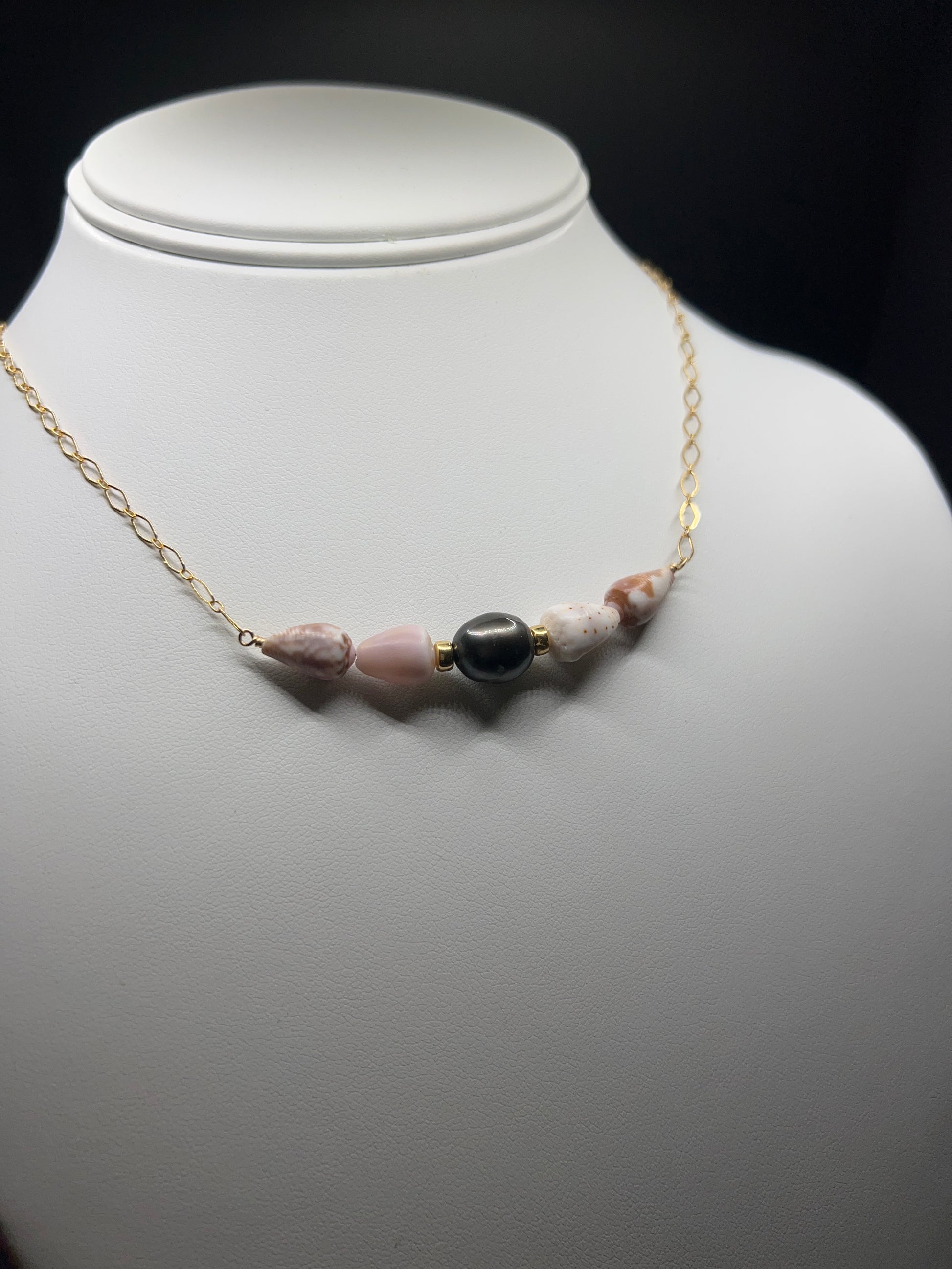 Minimal yet deeply connected to the sea, the Kai Bar Necklace is a tribute to the ocean’s timeless beauty. Featuring a sleek horizontal bar design, this piece is adorned with handpicked cone shells and a radiant Tahitian pearl. The name Kai—Hawaiian for "sea"—perfectly reflects the tranquil yet powerful spirit of the ocean.